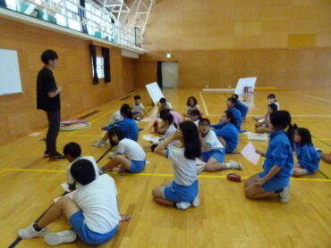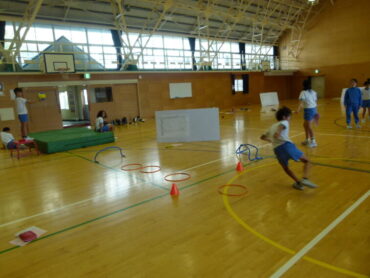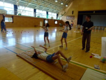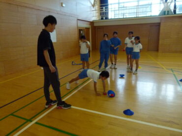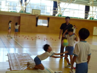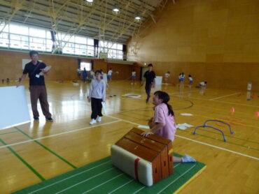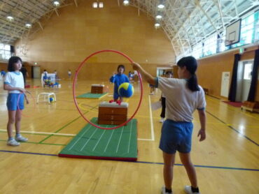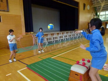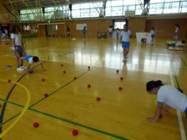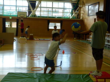 体育館に6カ所のポイントを作り、玉入れの玉やセフティマット、跳び箱やボールなどを使って自分たちでできる運動を考えました。