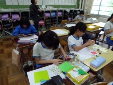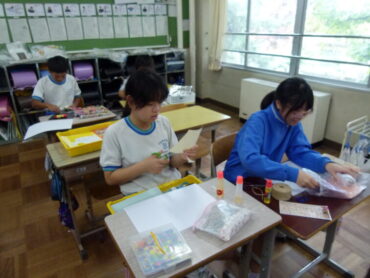 様々な材料を自分のイメージしたとおりに並べ、貼り付けながら、画用紙の中に独創的な世界を創造していきます。