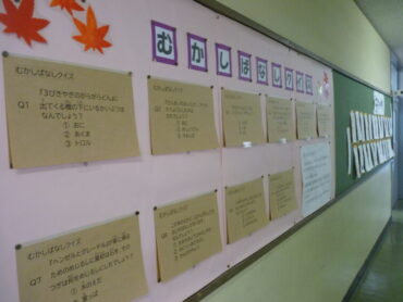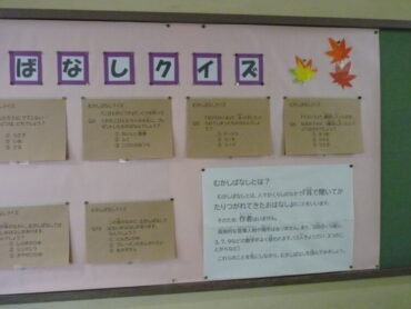 図書室前に、むかしばなしクイズが掲示されています。