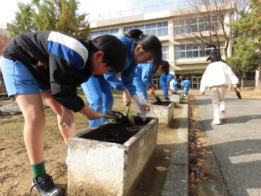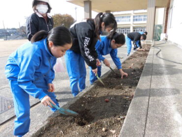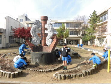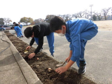 2025.11.27 4年生 5年生 6年生 環境委員会「チューリップとムスカリの植え付け 環境委員会の児童が校庭のプランターや中庭・前庭の花壇にチューリップとムスカリの球根を植えてくれました。 同じ色が固まらないように、色とりどりのチューリップを分担して配置し、バランスを確認したうえで植え付けました。芽の出る方を上にして、1~2cm土がかぶるように植えました。 どのくらいの深さまで掘ればいいのか、どの程度土を押さえていいのか、みんな手さぐりでこわごわという感じでしたが、長休みでなんとか植えることができました。 来春、雪解けとともに目を出してくれることを楽しみにしています。