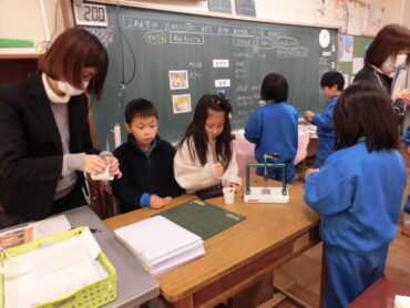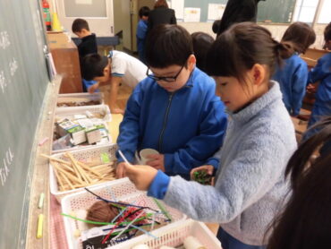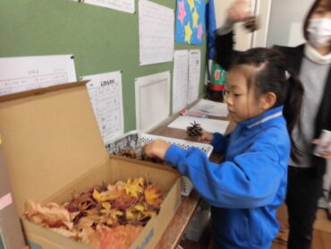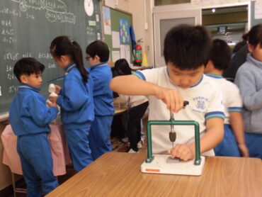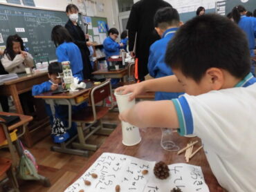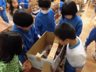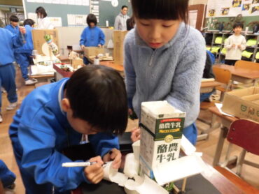 1年生が先日、2年生と一緒に保育園の年長さんを招いて行った「秋のあそびランド」のおもちゃを改良して、今度は2年生を招待しようと準備を進めています。