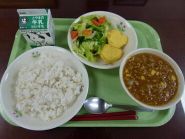 今日は、「『飢餓をゼロに』ー未来の食事献立ー」がテーマで、大豆ミートを使ったカレーが登場しました。「大豆ミート」とは、大豆で作られたお肉のような見た目や食感の食べ物です。