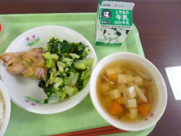 2026.1.29 1年生 2年生 3年生 4年生 5年生 6年生 全校生 学校給食週間3日目 学校給食週間3日目のテーマは、「住み続けられるまちづくりをー地場産品献立ー」です。 「地産地消」のよさは、新鮮でおいしい地元の食材が食べられることです。また、食材を運ぶエネルギーを節約することもできます。 3日目のメニューは、高岡産のネギ味噌をかけたふくらぎや高岡野菜を使ったけんちん汁やおひたしでした。また、デザートは、国吉りんごゼリーでした。 地場産の新鮮な食材を味わいました。