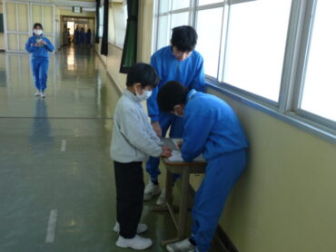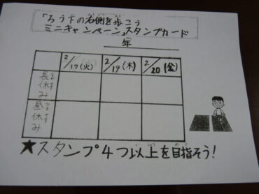 2026.2.20 1年生 2年生 3年生 4年生 5年生 6年生 全校生 廊下の右側を歩こうミニキャンペーン(保健衛生委員会) 冬は、室内で過ごす時間が増えます。 伏木っ子が安全に過ごせるようにと、保健衛生委員会が「廊下の右側を歩こうミニキャンペーン」を実施しました。 休み時間に廊下を歩き、各ポイントでスタンプをもらうという企画です。スタンプは4つ以上を目指します。 休み時間、カードを手に静かに廊下を歩く子供たち。 安全に過ごそうという気持ちが、全校に広がっています。