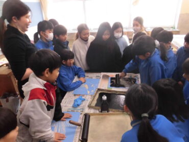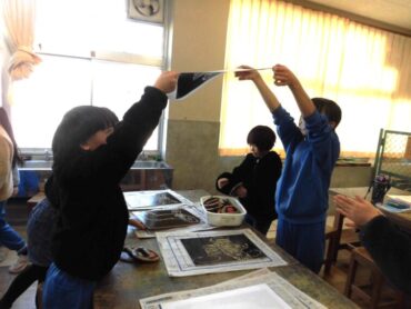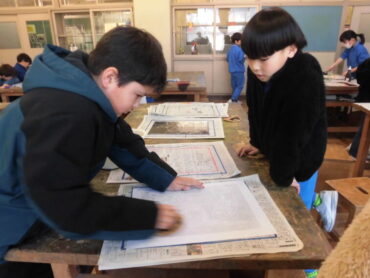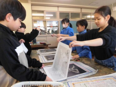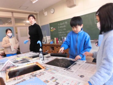 2026.3.16 NEW 3年生 3年 図画工作科「木版画:動物のせかい」 3年生が木版画に挑戦しました。 木の板に好きな動物の姿を描き、彫った部分が白くなることを意識しながら彫刻刀で彫りました。 今日はいよいよ印刷する日です。 2人でペアになって、ローラーで版に黒いインクをのせ、裏表に気を付けながら紙を置きます。 中心から空気を抜くようにバレンでこすると彫った跡がきれいに浮かび上がりました。 自分で描いた原画ですが、白黒ではっきりと刷り上がると笑顔が広がり、拍手が起きました。